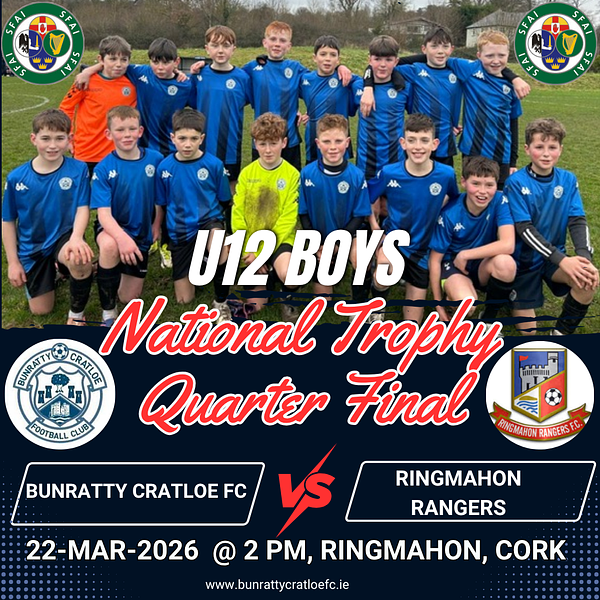 Best of luck to our U12s Boys who are in the Last 8 of the SFAI National Trophy vs Ringmahon Rangers on Sunday 22nd in Cork @ 2pm.